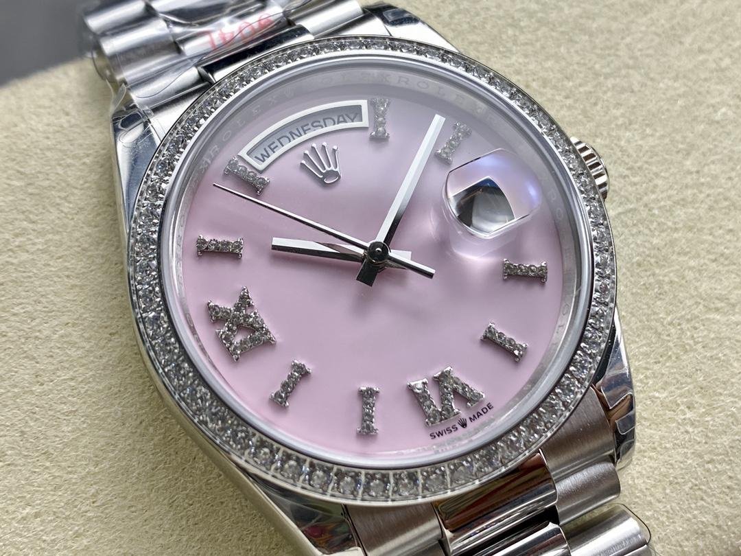 Rolex Day Date 36 Platinum Opal Pink Set with Diamonds Roman Dial Diamond Bezel m128396tbr 0009