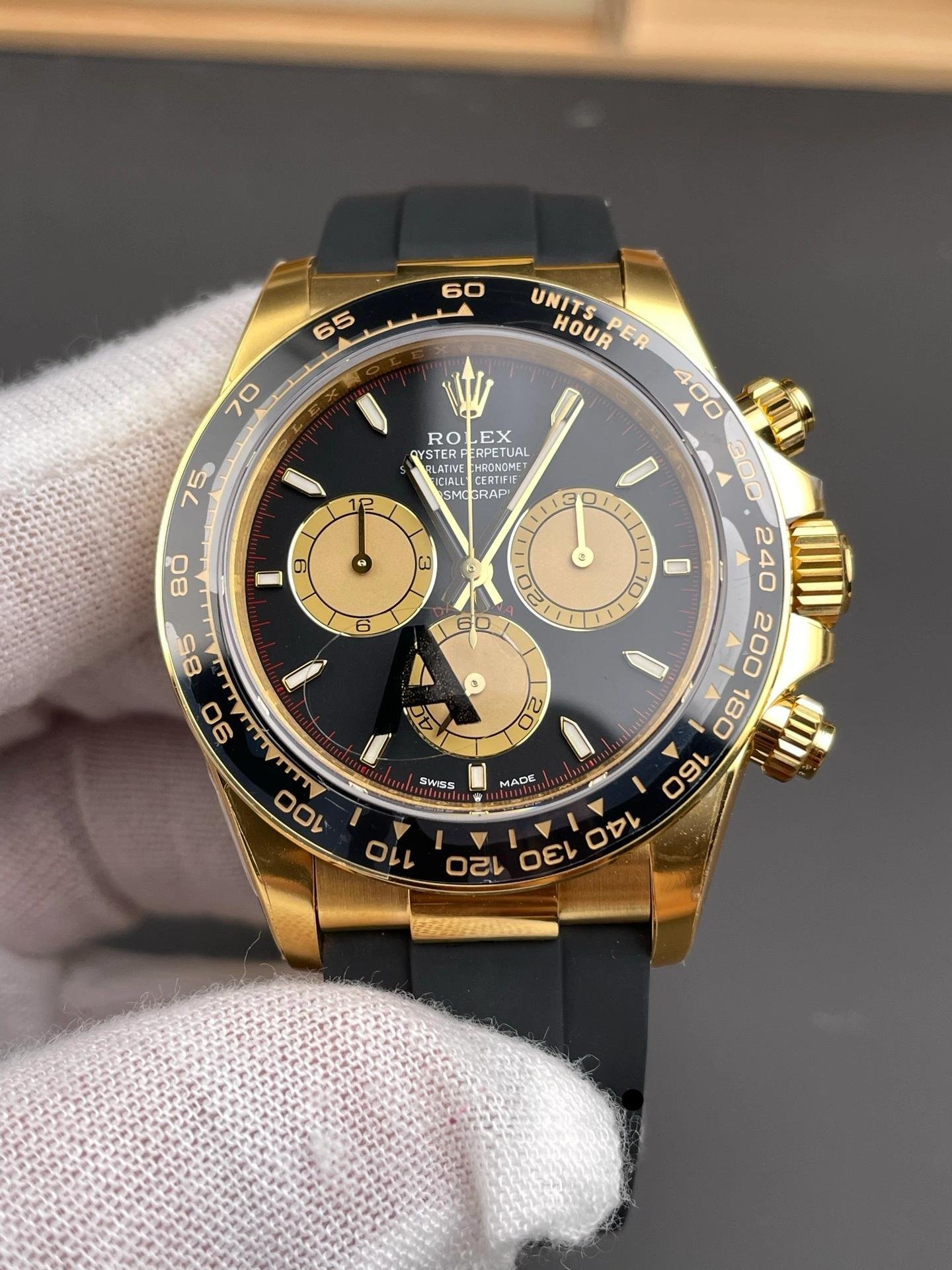 Tag: 40 mm, caja dorada, correa de caucho., esfera negra, Para hombre